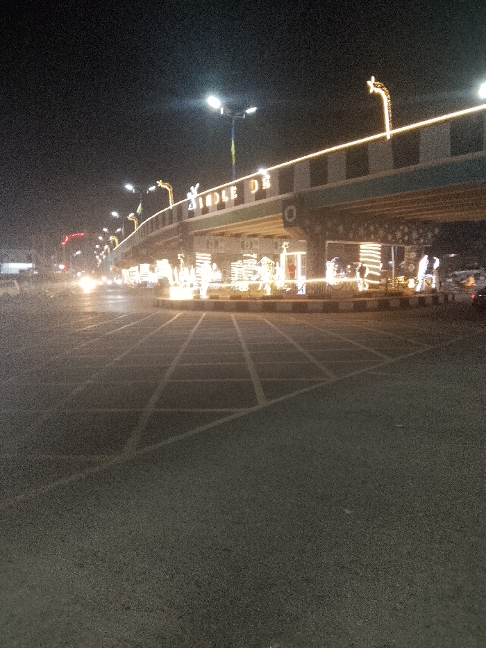 A nighttime view showcases a bridge adorned with bright lights, spelling out "Irole De" in large illuminated letters. The bridge has decorative lights hanging below it. The road surface shows painted lane markings leading towards the bridge. Streetlights illuminate the scene, and car headlights are visible in the distance. The scene appears to be at night in a town.