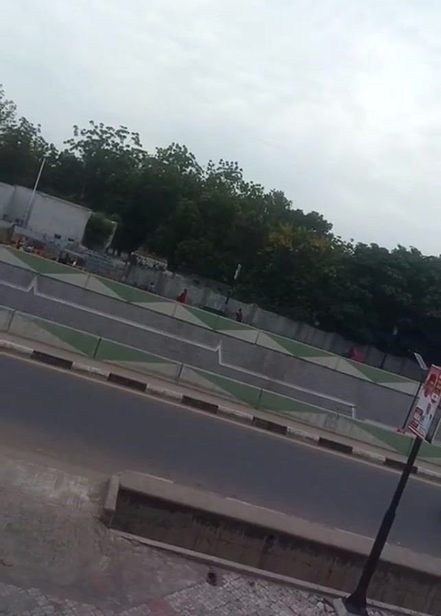 The video, shot from an elevated perspective, depicts a road with sparse traffic. A yellow auto-rickshaw is seen passing by. The road is bordered by a green and grey median barrier on one side and a paved sidewalk with a drainage ditch on the other. A row of trees lines one side of the road, and a building with a white wall is visible behind them. The sky overhead appears overcast.