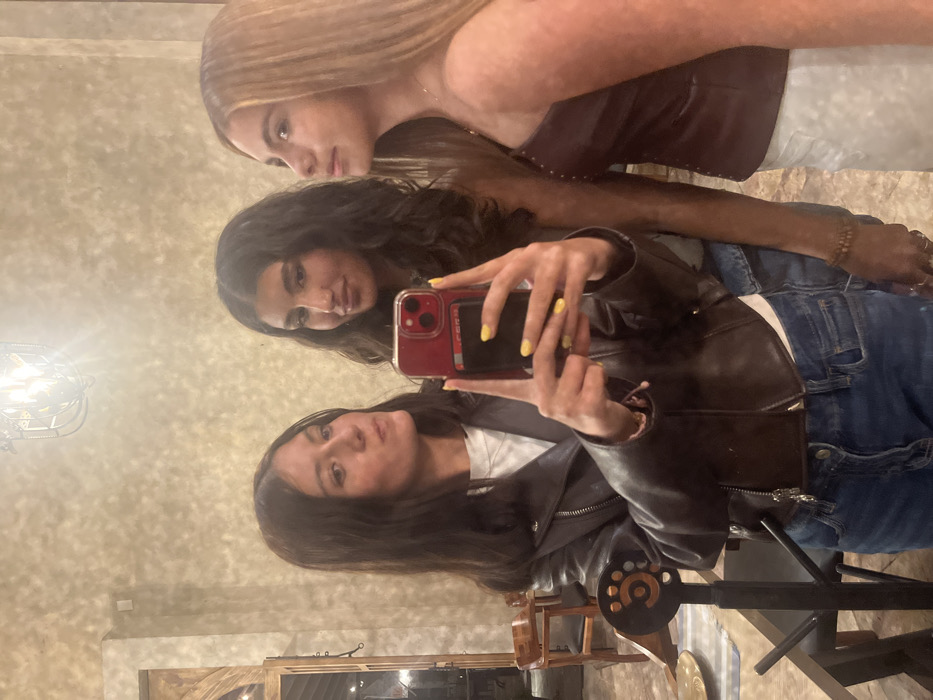 Three young adult females are depicted in an indoor setting in Domingo Arenas, Mexico, appearing to take a mirror selfie