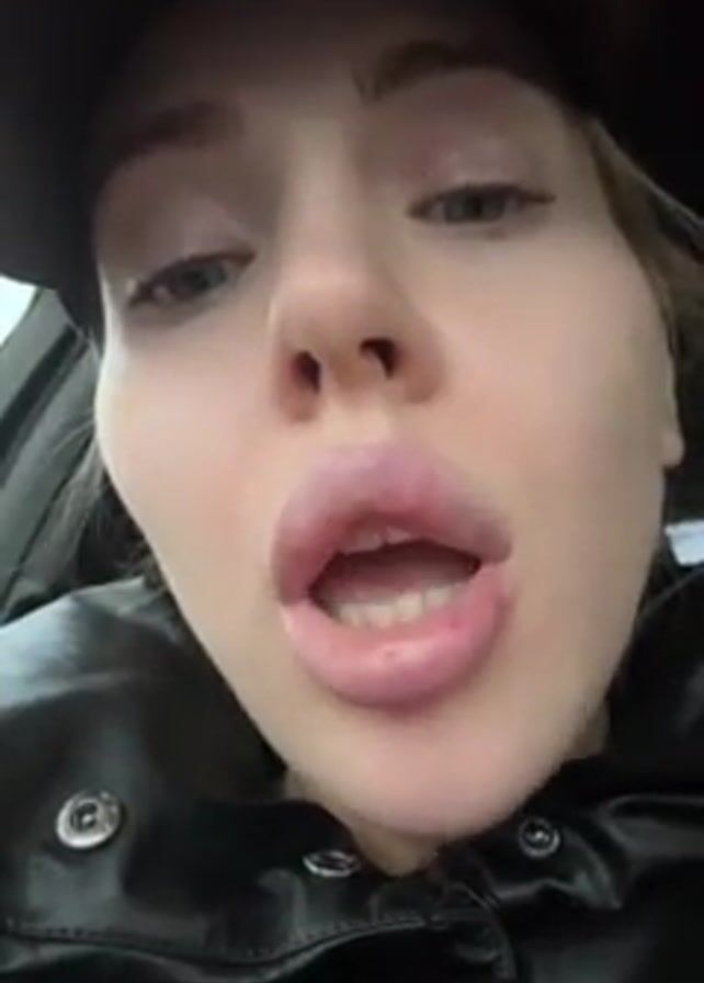 A close-up, low-angle video shows a young woman in a car. She is fair-skinned with blue eyes, and appears to have lip fillers. She's wearing a black leather jacket and a brown baseball cap. Her mouth is slightly open and she’s looking directly at the camera, seemingly talking or mouthing words. Outside the car window, one can see what appears to be a city street with buildings. The lighting is somewhat dim.