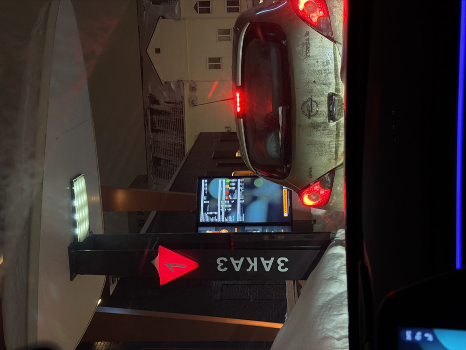 A silver Opel Corsa, dirtied by winter conditions, waits in a drive-through. A screen displays a menu of food items. Adjacent is a black sign with the Russian word "ЗАКАЗ" (order) and a red triangle with the number "1". The photograph is taken from inside a car, and the blurred interior elements are visible on the right side. Buildings can be seen in the background, partially covered with snow.