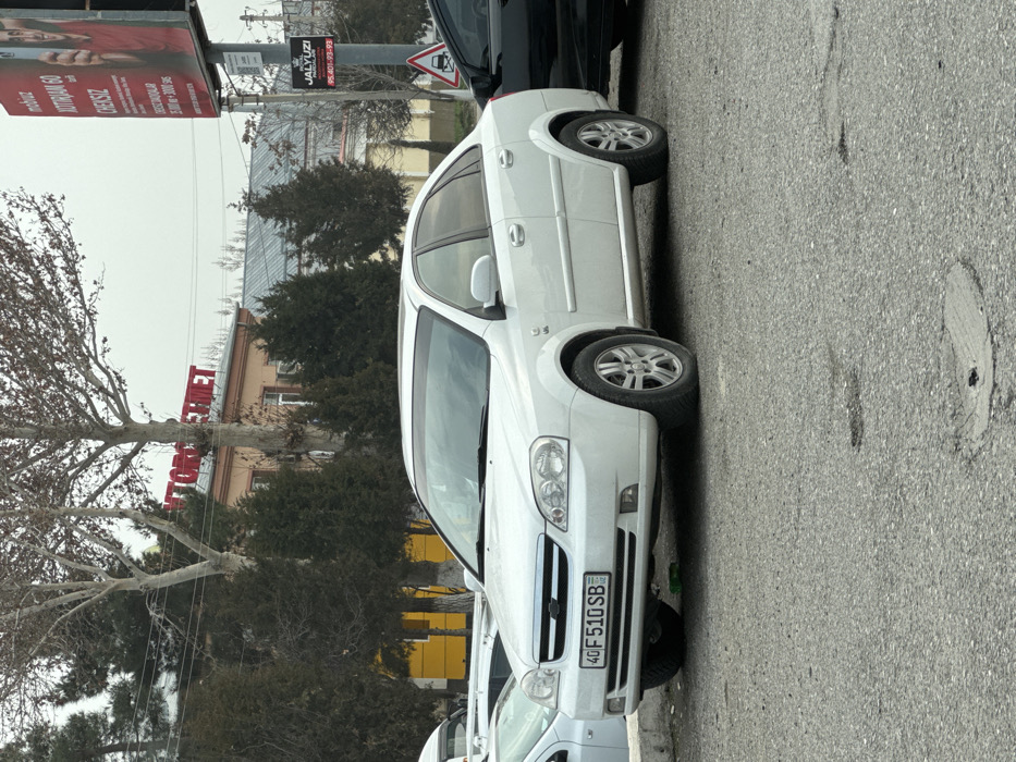 The scene depicts a static, outdoor environment within a commercial area along a street in Fergana City, Uzbekistan. In the foreground, a white Chevrolet Lacetti sedan (license plate "40 F 510 SB" indicating Fergana Region) is parked on an asphalt surface, angled slightly left. The pavement exhibits minor wear and patched areas. To the white car's immediate right, a portion of a dark-colored sedan is visible. To the far left, a white van or similar vehicle is partially visible behind the white sedan. The mid-ground features a two-story building with a light brown/peach facade, topped by large red letters spelling "AVTOXIZMAT" (Auto Service). Behind this building, a yellow structure is partially discernible. Numerous trees, including leafless deciduous types and dark green coniferous varieties, are scattered across the mid-ground, partially obscuring the buildings. To the right mid-ground, a large billboard structure stands tall. The upper section displays an advertisement for "Mobiuz" mobile services, featuring a person holding a smartphone and text including "XOTIRJAM 60 CHENSIZ". Below this, a smaller sign attached to the billboard pole reads "JALYUZI" (Blinds) followed by a phone number (95-401-93-93). A red triangular road sign depicting an uneven road surface is mounted further down the pole. Behind the billboard, another building with a grey, possibly metallic, roof is visible in the distance. The sky is overcast and uniformly grey, indicating a cloudy day. No individuals are present within the frame. The scene suggests a typical urban street during cooler months, given the bare deciduous trees.