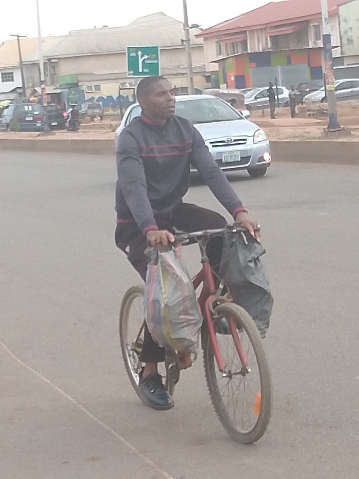 A man rides a red bicycle down a paved street. He wears a navy tracksuit, black pants, and black shoes. The bicycle has a clear plastic bag and a black trash bag hanging from the handlebars. Behind him is a silver Toyota sedan. In the background are buildings, parked cars, and pedestrians on the sidewalk. A green road sign is visible above the cyclist.