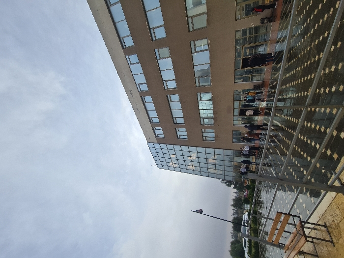 A tall, tan building with numerous windows dominates the view. The lower levels feature a wall of glass windows. People are gathered near the entrance under a patterned, covered walkway. A street lamp stands in the lower part of the frame, and a bench sits to the right. The sky above is overcast, suggesting a rainy or cloudy day.