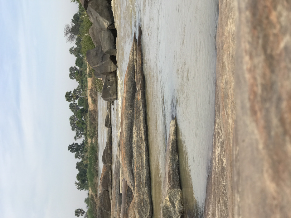 A river flows past jagged, layered rocks. A shoreline of trees lines the far bank under a pale sky. Boulders are also present on the left. The river appears shallow, with rocks protruding above the water's surface, creating small waterfalls. A large rock formation dominates the right foreground.