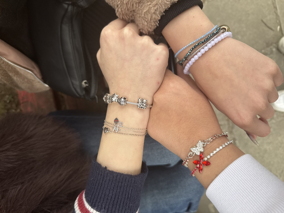 Three female forearms and wrists are presented in a layered arrangement, viewed from a top-down perspective, against an out-of-focus outdoor background in Yambol, Bulgaria. The uppermost arm, originating from the top left, exhibits fair skin and wears a dark blue sweater with a red and white striped cuff. This wrist features two slender silver-toned chain bracelets, one with small heart charms (one red-accented, one with the letter 'D'), and a heavier silver-toned charm bracelet adorned with multiple sculpted beads. The arm below this, on the lower left, has a medium skin tone and is clad in a white long-sleeved garment. It displays two prominent silver-toned bracelets: one set with a red crystal floral design and another with a clear crystal butterfly motif. The visible fingernails on this hand are long and pointed. The third arm enters from the right, partially covered by a light brown, possibly textured garment, and a dark sleeve. This arm, also with fair skin, showcases a stack of multiple layered bracelets including a strand of light purple beads, a silver-toned chain, a strand of dark blue-green beads, and a delicate light blue beaded bracelet. A silver-toned ring with an ornate design is visible on a finger of this hand. The arms are positioned with the upper-left arm resting over the lower-left arm, and the right arm resting over both, creating a central intersection point. The background, rendered indistinct by shallow depth of field, suggests a light-colored paved or concrete outdoor surface.
