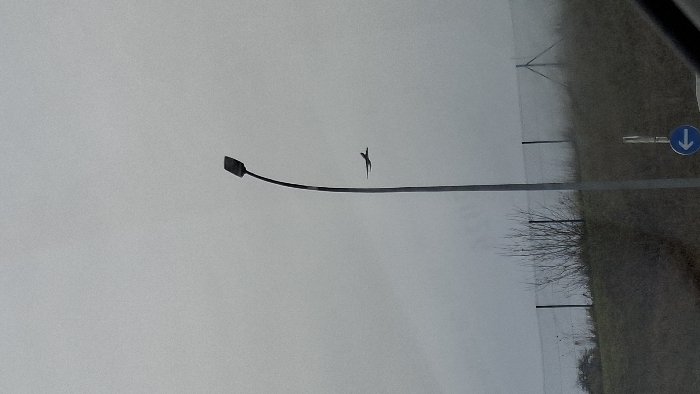 The image captures an outdoor scene in Pontpierre, Luxembourg, under an overcast and hazy grey sky. A prominent, tall, dark street light pole, with a curved upper section and a rectangular light fixture, stands in the center-right of the frame. To the right of this pole and in the mid-distance, a dark twin-engine jet aircraft is observed in horizontal flight against the pale sky. The lower section of the image features a gently sloping grassy embankment, topped by a dark chain-link fence. Sparse, bare deciduous vegetation is visible along the embankment, particularly on the left side. In the bottom-right corner, a blue circular road sign displaying a white left-pointing arrow is partially visible, obscured by what appears to be an interior component of a vehicle. No individuals are present in the scene.