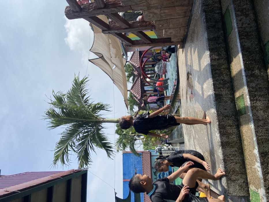 A rotated snapshot captures a sunny day at a water park. Three children are partially visible, appearing to be playing or getting wet. One stands near the water's edge, while two others are near the steps. In the background, a small pool area is occupied by other people. The water park setting is suggested by the presence of a palm tree, a sunshade structure, and colorful buildings. A set of wet concrete steps dominates the right side of the image.