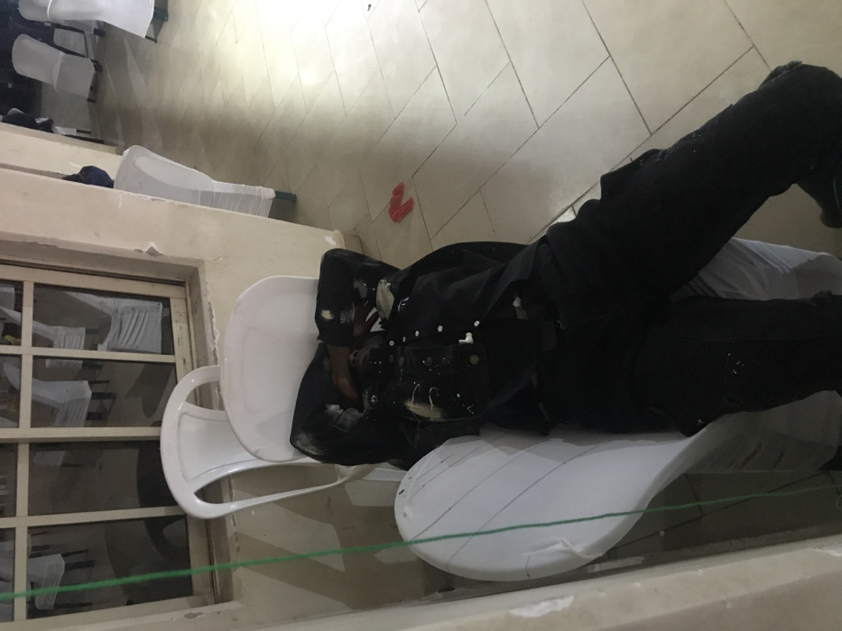 A person wearing black clothing and paint splattered on their torso lies prone across two stacked white plastic chairs. The chairs sit near a window with multiple panes. Other white covered chairs line the wall in the background. The floor is tiled. A red object is visible on the floor in the background. A green wire is strung across the bottom of the image.