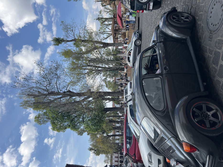 A line of parked vehicles, including classic Volkswagen Beetles, along a cobblestone street. Tall trees with sparse foliage line the street, leading towards a bustling plaza with people and red umbrellas. A bright blue sky filled with white clouds is visible above the trees. A sewer cap is seen on the right side of the road. The image is slightly rotated counter-clockwise.