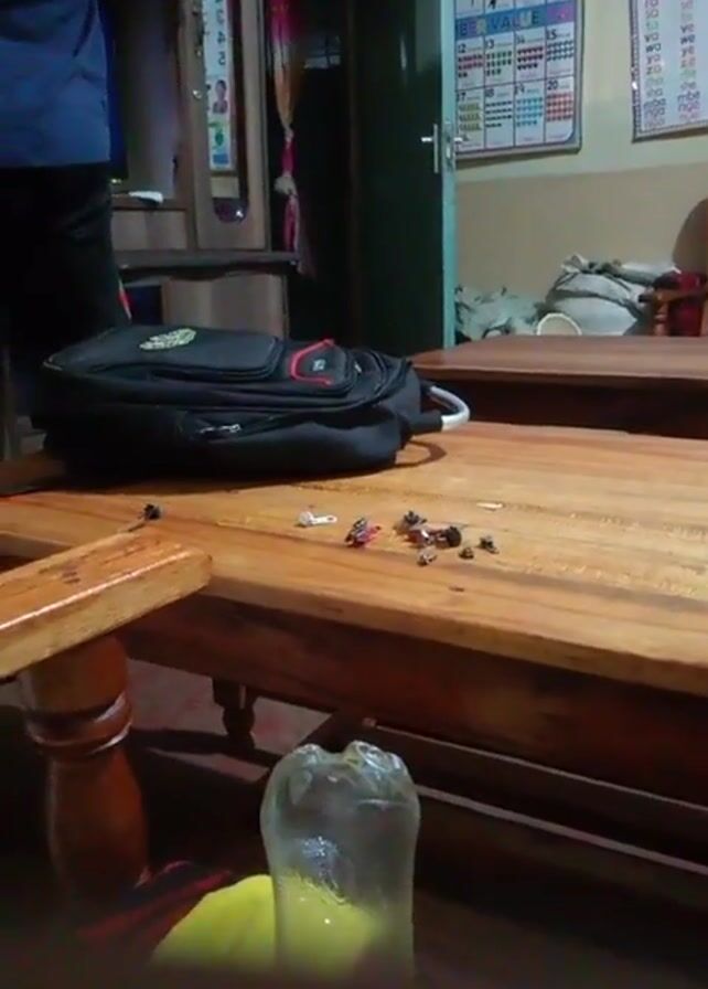 room with wooden tables, a black backpack on one of the tables, and various small items scattered around it. A person wearing a blue shirt and dark pants is standing near the table. A water bottle and some clothing are visible in the foreground, partially obscuring the view. There's a cabinet, a door, and calendars on the wall in the background. The scene is still, and there are no clear actions or interactions occurring.