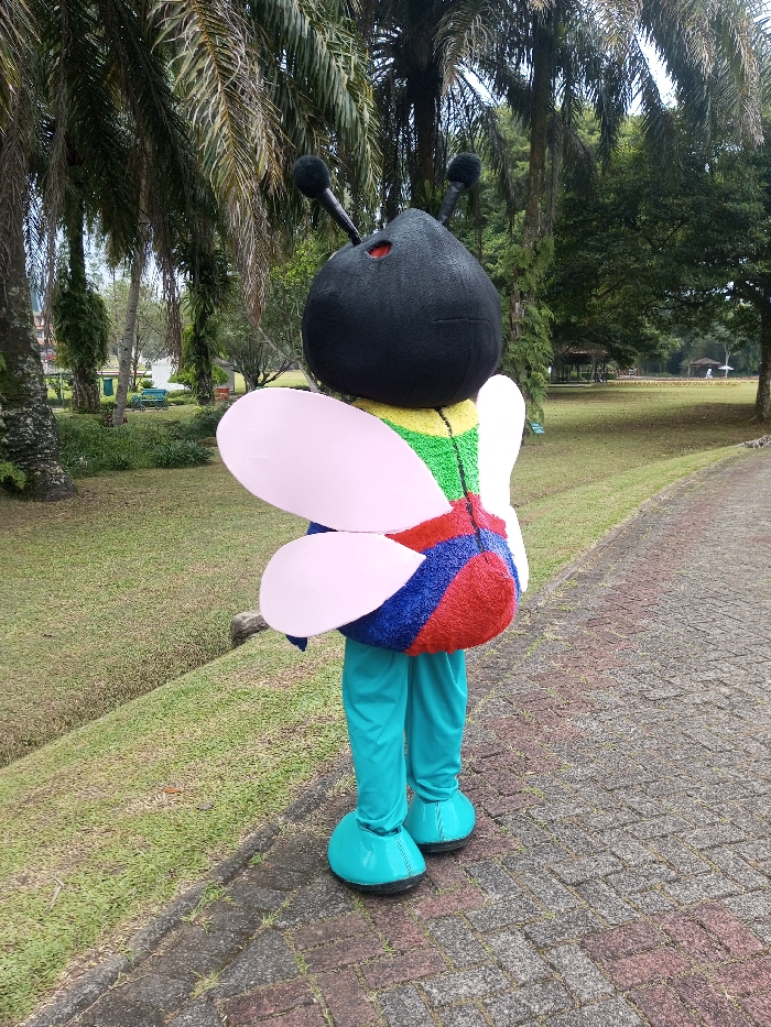 A person in a colorful butterfly costume stands with its back facing the viewer. The costume has a black head with antennae, a multi-colored body, pink wings, and teal pants and feet coverings. They stand on a stone-paved path. Lush green grass and trees fill the background. The scene appears to be in a park-like setting.