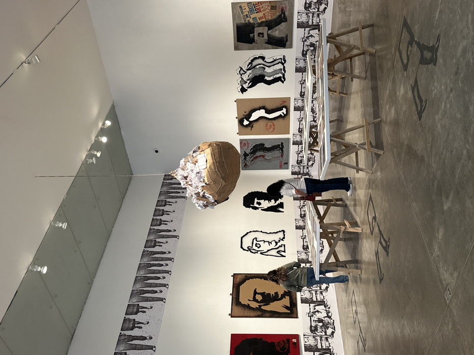 An art gallery features a tall, white wall displaying various artworks, including portraits and abstract pieces. A large, spherical sculpture hangs from the ceiling. Two visitors stand looking at artwork, their reflections visible on the polished floor. Sawhorse-style tables line the floor, supporting unframed canvases. Prints and shadows of figures are visible on the concrete floor. Bright lights illuminate the space.