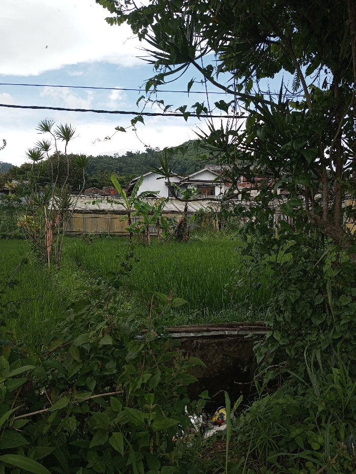 The image presents an outdoor scene in Ariyalai, Sri Lanka, combining agricultural and residential elements under a sky with scattered clouds. In the immediate foreground, dense green foliage, comprising bushes and climbing vines, partially obscures a concrete culvert. A weathered wooden plank rests across the top of this culvert. Inside the culvert's opening, discarded refuse, including various plastic materials and colorful packaging, is visible. The midground is dominated by an expansive, uniformly green rice paddy field. Beyond the field, a long, low-profile structure with a light-colored roof and slatted, possibly bamboo, walls is situated. This area also contains various plants, including banana trees and several tall, slender trees with spiky crowns. In the background, multiple residential buildings with white exteriors and dark, likely tiled, roofs are visible; some structures appear to be two stories. Further in the distance, a range of hills covered in dense green vegetation forms the horizon line. Overhead, dark utility lines traverse the upper portion of the frame, partially intertwined with tree branches and vines. No individuals are present in the scene.