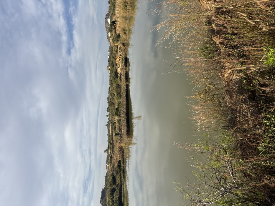 A narrow, still body of water reflects the sky. The horizon line shows dry, undulating terrain covered with sparse vegetation. The right side of the frame contains a bank overgrown with tall, brown grasses and some green foliage near the bottom. The left side mirrors the landscape in the water, the sky showing a mix of light clouds and blue patches. The overall scene evokes a tranquil, rural atmosphere.