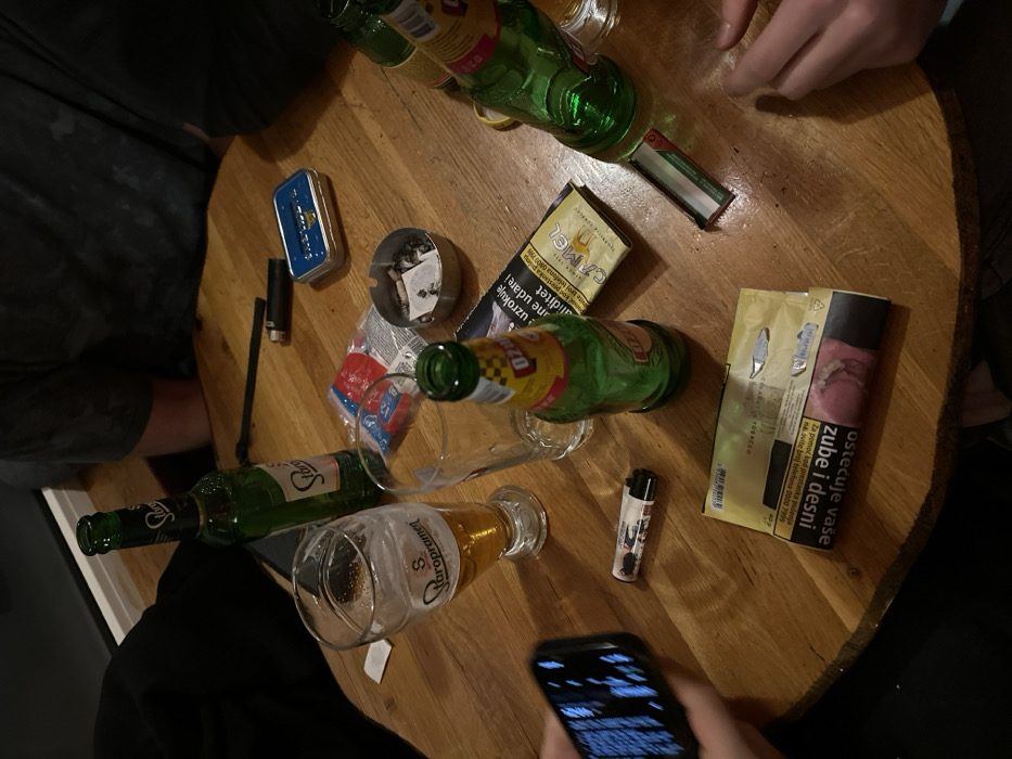 - "A wooden table is littered with beer bottles, a mostly empty glass, cigarette packs ("Camel," "Tobacco"), rolling papers, a lighter, a tin, and an ashtray filled with cigarette butts" by FM-SZdeq2, licensed under CC BY 4.0
