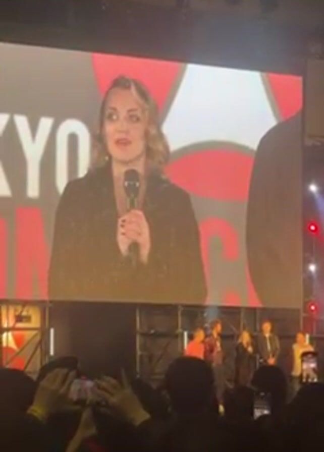 Captured from a ground-level perspective within a crowd, the video features a large screen displaying a woman with light blonde hair, wearing a black jacket and a silver necklace. She's speaking into a microphone. The text "TOKYO" is visible on the screen. Below the screen, a group of people stand on a stage, with the crowd holding up phones to record. The lighting is somewhat dark with stage lights visible.