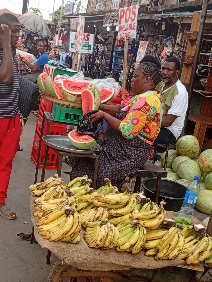 A street vendor sits behind a cart loaded with bananas and watermelons. She is dressed in a colorful top. A man sits behind her. Watermelons, cut into wedges, are piled on green crates and a metal tray. Bananas fill the cart's surface, arranged in bunches. A water bottle sits at the back of the cart. Signs for POS (Point of Sale) availability are visible in the background. A man in red pants stands in the left corner.