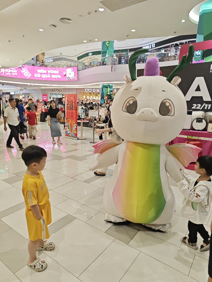 An interior shot depicts a brightly lit, multi-level shopping mall in Ho Chi Minh City, Vietnam. In the foreground, a young boy in a yellow short-sleeved shirt and shorts, wearing white and black patterned clogs, stands facing right, observing a large, inflatable, white mascot. The mascot, resembling a stylized mythical creature, features green antlers, a purple topknot, large eyes, a rounded body with a rainbow-striped belly (yellow, green, and pink hues), and pink and white wings. A second young child, partially visible on the right, holds the mascot's hand. In the mid-ground, multiple adults are walking, including a woman in a black top and light blue denim skirt carrying a brown bag, and a man in a white polo shirt. The background features various retail storefronts with visible signs such as "ALDO" and "O O W L S," promotional banners in pink with Vietnamese text "NIỀM VỌNG CÓ QUÀ 100%" and "22/11," and a red banner displaying "DỊP SẮN HƠN VUA." Retail displays with clothing and small home appliances are visible. The floor is composed of light-colored tiles with subtle geometric patterns. The mall architecture includes high ceilings with recessed lighting and glass railings indicating multiple levels.
