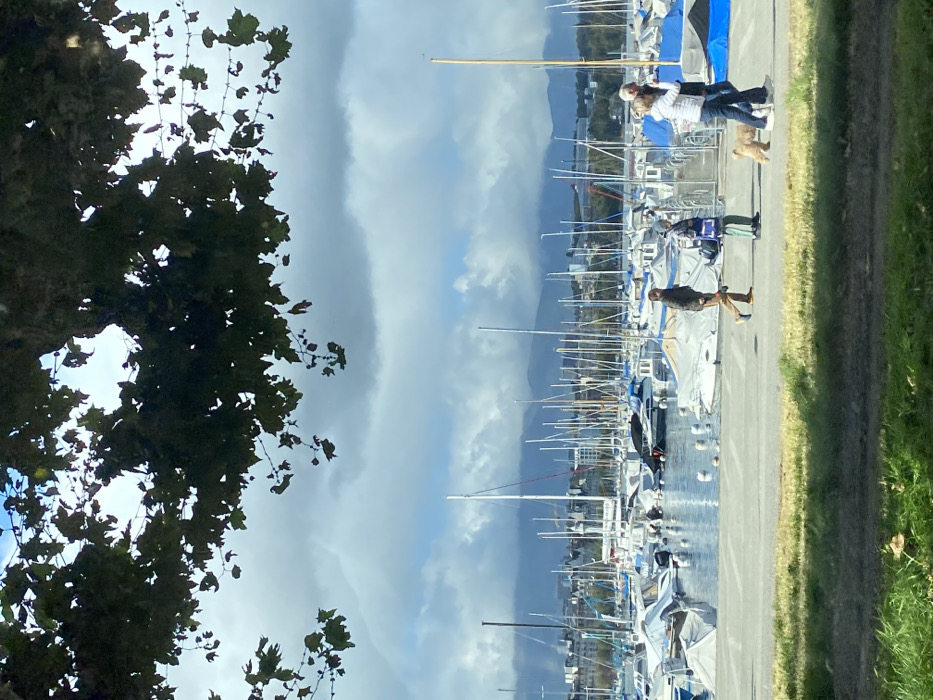 The image depicts a marina scene on Lake Geneva in Geneva, Switzerland, on a day with mixed sun and clouds. The upper portion of the frame is obscured by the dark green foliage of an overhead tree. Below this, a wide body of water is filled with numerous docked boats, predominantly sailboats and some motorboats. Many vessels are covered with white or blue protective tarpaulins, and white buoys are visible in the water. In the mid-ground, a paved pedestrian pathway runs horizontally along the water's edge, separated from the viewer by a narrow strip of green grass in the lower foreground. On this path, four individuals and one dog are observed walking from left to right. From left to right, a male figure in a dark jacket and light brown pants walks alone. Next, a smaller figure, possibly a child or young adult, in a blue jacket and dark pants carries a blue and white shoulder bag. Following them, an older couple walks together; the woman wears a white jacket and dark pants, while the man wears a dark jacket and blue jeans. A light-brown, shaggy-haired dog walks slightly ahead of the couple. The background features a cityscape beyond the marina, with various buildings visible. Further in the distance, a range of mountains, consistent with the French Alps, is partially obscured by low-hanging clouds. The sky displays a mix of blue patches and large white and grey cumulus clouds, with some visible sun rays piercing through the cloud cover.