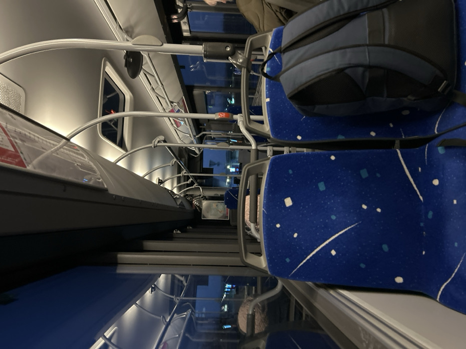 The image depicts the interior of a bus or train. Blue patterned seats line the aisle, with a dark backpack resting on one. Metal handrails run overhead. A window shows a night cityscape. Signage is affixed to the wall. The floor reflects the interior, creating a mirrored effect.