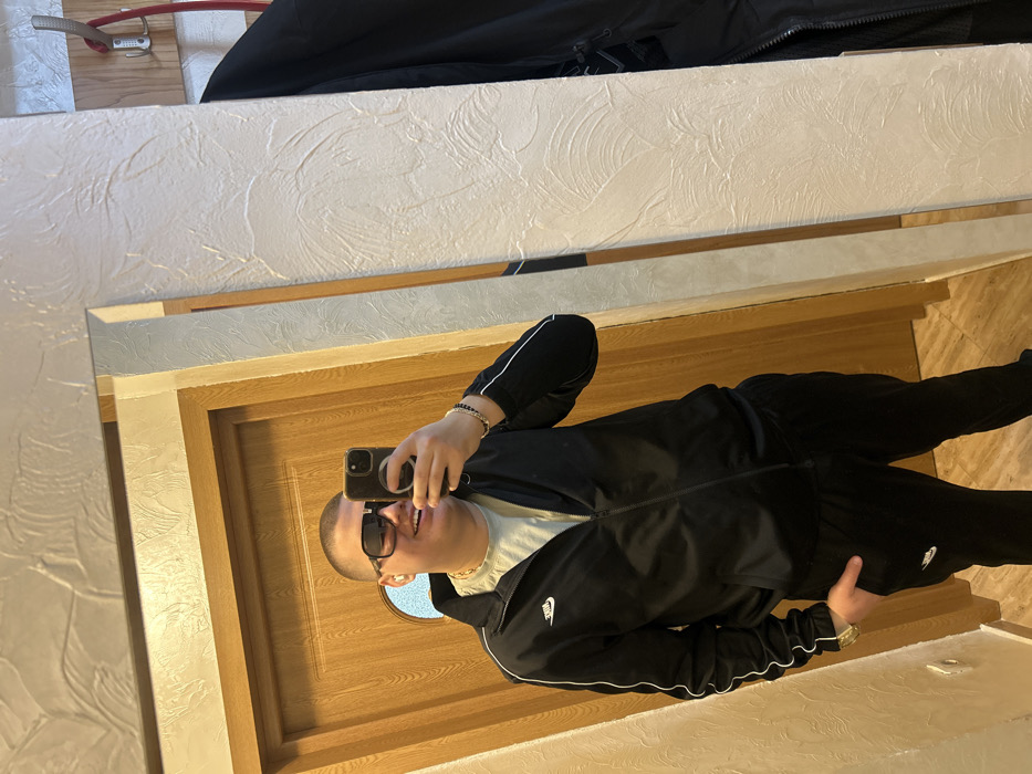 A male individual is captured in a mirror selfie within an indoor setting. He has a buzz cut hairstyle and wears dark, rectangular sunglasses along with a white earbud in his right ear. His attire consists of a black Nike tracksuit jacket with white stripes along the sleeves, worn over a light-colored t-shirt, and matching black Nike tracksuit bottoms with a small white logo on the left thigh. A golden watch is visible on his left wrist and a beaded bracelet on his right. He is smiling, exposing his teeth, while holding a dark-colored smartphone, fitted with a magnetic ring, in his right hand to photograph his reflection. The reflected environment behind the individual suggests an interior space, likely a hallway. A light-colored wooden door with a circular glass panel is visible to the left of the reflection. To the right, a wall covered with light-colored, textured wallpaper features a wooden coat rack with metal hooks, from which a dark jacket and a red strap are hanging. A light switch or power outlet is positioned on the lower left wall, and the flooring appears to be light-colored. The mirror is framed with a light-colored border. The specific location within Ruse, Bulgaria, cannot be determined from the visual cues presented in the image.