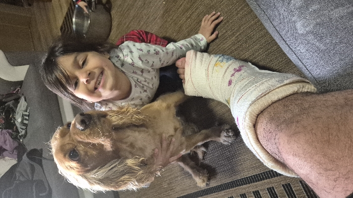 This image depicts an indoor domestic scene located in Melle, Belgium. In the foreground, a human leg, appearing hairy and partially covered by grey pants, extends into the frame. The foot and ankle of this leg are encased in a white plaster cast adorned with faint colored markings, primarily pink and blue. Further back, a young child with dark hair, estimated to be between three and five years old, is seen crouching on the wooden floor. The child is wearing a white long-sleeve shirt with a floral or patterned design and red and white plaid pants. The child is smiling broadly, directly facing the camera, and has their hands gently placed around the mid-section of a tan-colored dog, resembling a Cocker Spaniel. The dog is sitting on the floor, looking upwards and slightly to its right, towards the camera. Its fur is shaggy, particularly around its ears and chest. In the background, a grey couch with a white armrest is visible, partially obscured by clothes or blankets draped upon it. To the right of the child, a large, reflective metal pot is resting on the wooden floor. A striped rug is partially visible under the dog and the child on the left side of the frame. The lighting suggests an artificial indoor source.