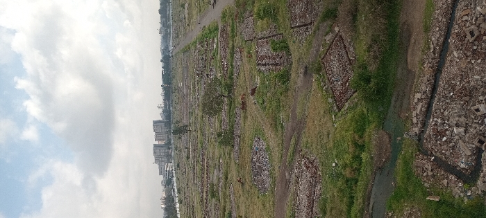 An aerial view shows a city edge with multi-story buildings contrasting with an expansive field. The field appears overgrown, interspersed with square or rectangular patches filled with debris, possibly from construction or demolition. A narrow, dark waterway meanders through the field. Sparse trees dot the landscape, and two cows are visible. The sky is overcast with scattered clouds. The scene suggests a transitional zone between urban development and wild, possibly degraded, land.