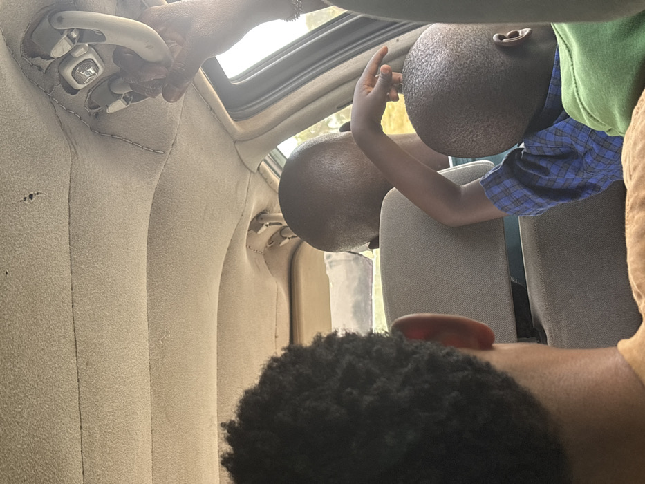 The image depicts the interior of a vehicle in Marke, Nigeria, during daylight hours. From the perspective of a rear passenger, the scene shows at least four individuals. In the immediate foreground, the back of a person's head with dark, curly hair and a visible ear is seen, wearing a light brown garment. Directly in front of this individual, partially obscured by a grey seat headrest, is the back of an adult's shaved head. To the right, a child with a shaved head, wearing a blue plaid shirt and a green garment, is seated. This child's left arm is raised, with their hand gently touching the crown of the shaved head in front of them. In the upper right quadrant, a dark-skinned hand adorned with a silver bracelet grips an overhead grab handle, which appears to be part of a damaged or exposed console on the beige, slightly sagging vehicle headliner. Light filters in from windows on the right side of the vehicle, revealing a blurry, sunlit outdoor environment consistent with natural terrain.