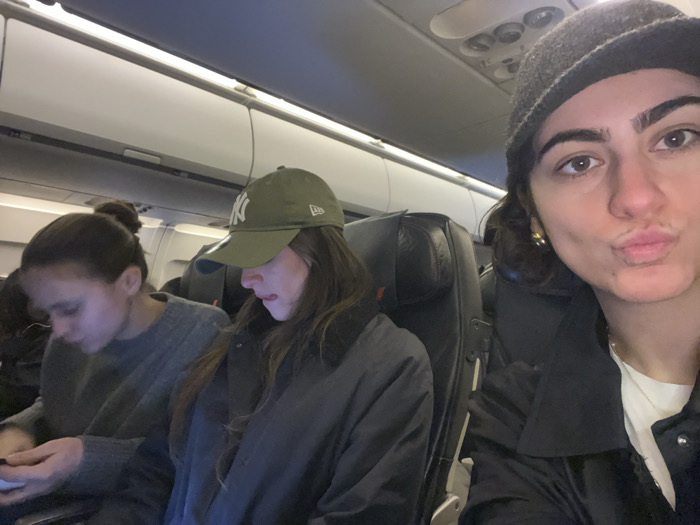 Three women are seated on an airplane. The woman to the left has her dark hair in a bun and is wearing a gray sweater, looking down at a device. The woman in the center wears a dark coat and an olive green Yankees baseball cap, also looking down. The woman on the right is taking a selfie, wearing a dark coat and a gray beanie. The interior of the plane is visible, with overhead bins and other passengers.