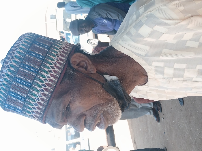 An outdoor scene in Plumtree, Zimbabwe, captures a group of individuals in a public area. The central figure is an elderly dark-skinned male, positioned in profile facing left, with his mouth slightly open. He wears a multi-colored patterned cap, predominantly featuring blue, green, brown, and white geometric designs, and a light-colored, possibly cream, long-sleeved garment with a textured or woven square and stripe pattern. A black disposable face mask hangs below his chin, with one ear loop visible behind his left ear. He exhibits a short, grey beard and mustache. In the mid-ground, to the right and slightly behind the primary subject, a second dark-skinned male is partially visible, wearing a dark cap and a dark long-sleeved top, looking towards the right. Further in the background, multiple light-colored vehicles, including a prominent white van, are visible. Another individual in a light blue garment is present in the far background. The ground is unpaved, appearing as compacted earth or gravel. The setting suggests a bustling street, market, or public transport hub within the city.