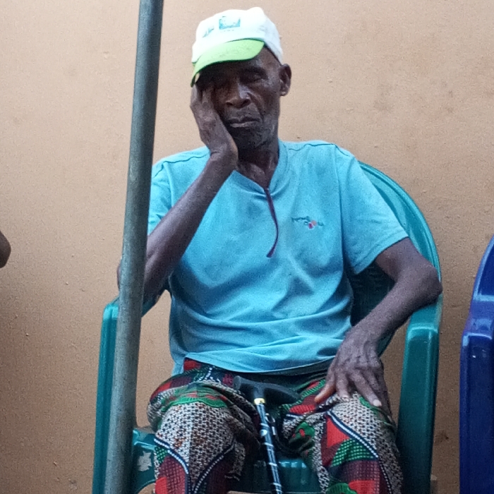 In Orlu, Nigeria, an elderly, dark-skinned male is depicted seated in a teal plastic chair against a light orange wall
