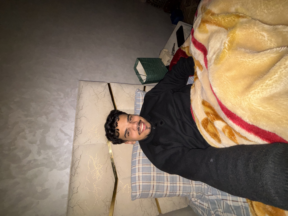 A man lies on a bed with a beige and gold headboard, covered in a blanket of yellow, beige, and red. He wears a black long-sleeve shirt and smiles at the camera. A green woven basket and a white box sit on the floor behind him. The room appears to be dimly lit, with a textured gray wall visible. The bedsheets have a plaid pattern.