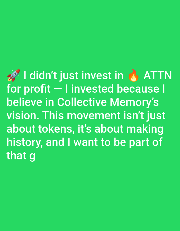 The image depicts a digital text graphic presented on a solid, uniform bright green background. White, sans-serif text, featuring two emojis, is centered horizontally and vertically within the lower two-thirds of the frame. The text reads: "🚀 I didn't just invest in 🔥 ATTN for profit – I invested because I believe in Collective Memory's vision. This movement isn't just about tokens, it's about making history, and I want to be part of that g". A red and orange rocket emoji (🚀) precedes the first line of text, and a red and orange flame emoji (🔥) is positioned before the acronym "ATTN". The final letter "g" of the last word is truncated at the very bottom edge of the image. The scene is entirely graphical and textual, with no discernible physical objects, individuals, or environmental features that would indicate a specific physical location within the city of Onitsha, Nigeria, or any other geographical area.
