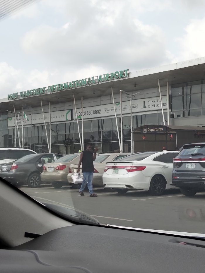 The image depicts the exterior of Port Harcourt International Airport in Port Harcourt, Nigeria, as viewed from inside a vehicle
