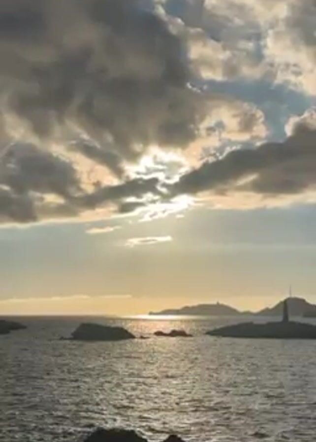 seascape at sunset or sunrise. There are several small, rocky islands dotting the water. In the distance, there appears to be a larger landmass and a lighthouse or similar structure is visible. The sky is filled with dramatic clouds, partially obscuring the sun, which casts a golden light across the water. The water surface is slightly choppy, with visible ripples and reflections of the sunlight. There are some dark rocks in the foreground.