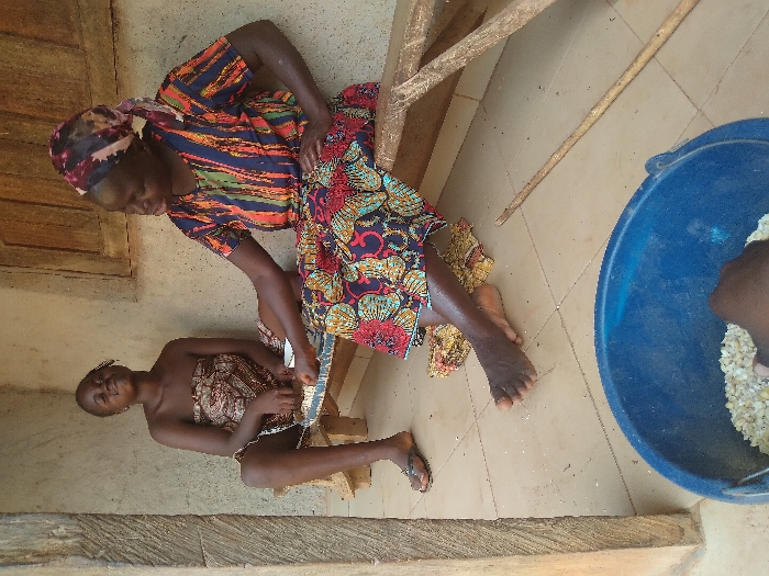Two women are working. One, wearing a colorful patterned dress and headscarf, sits on a stool. The second woman, draped in fabric, sits opposite. They are working together, possibly processing food, with a blue tub containing material next to them. A wooden frame lies on the ground. The scene appears to be taking place in or just outside a modest dwelling.