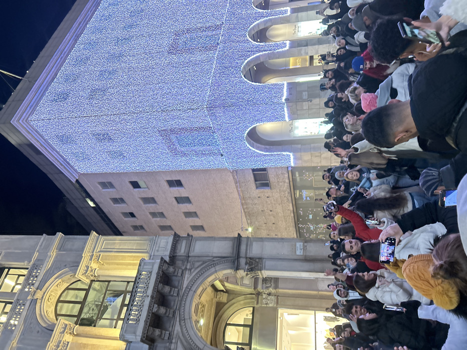 A nighttime scene depicts a large crowd gathered in a city. The architecture features arches and decorative elements, with windows visible on adjacent buildings. The crowd is dense, with many individuals holding up phones to capture the event. A large illuminated structure, possibly a holiday decoration or art installation, hangs above the crowd. The overall atmosphere suggests a festive or celebratory occasion.