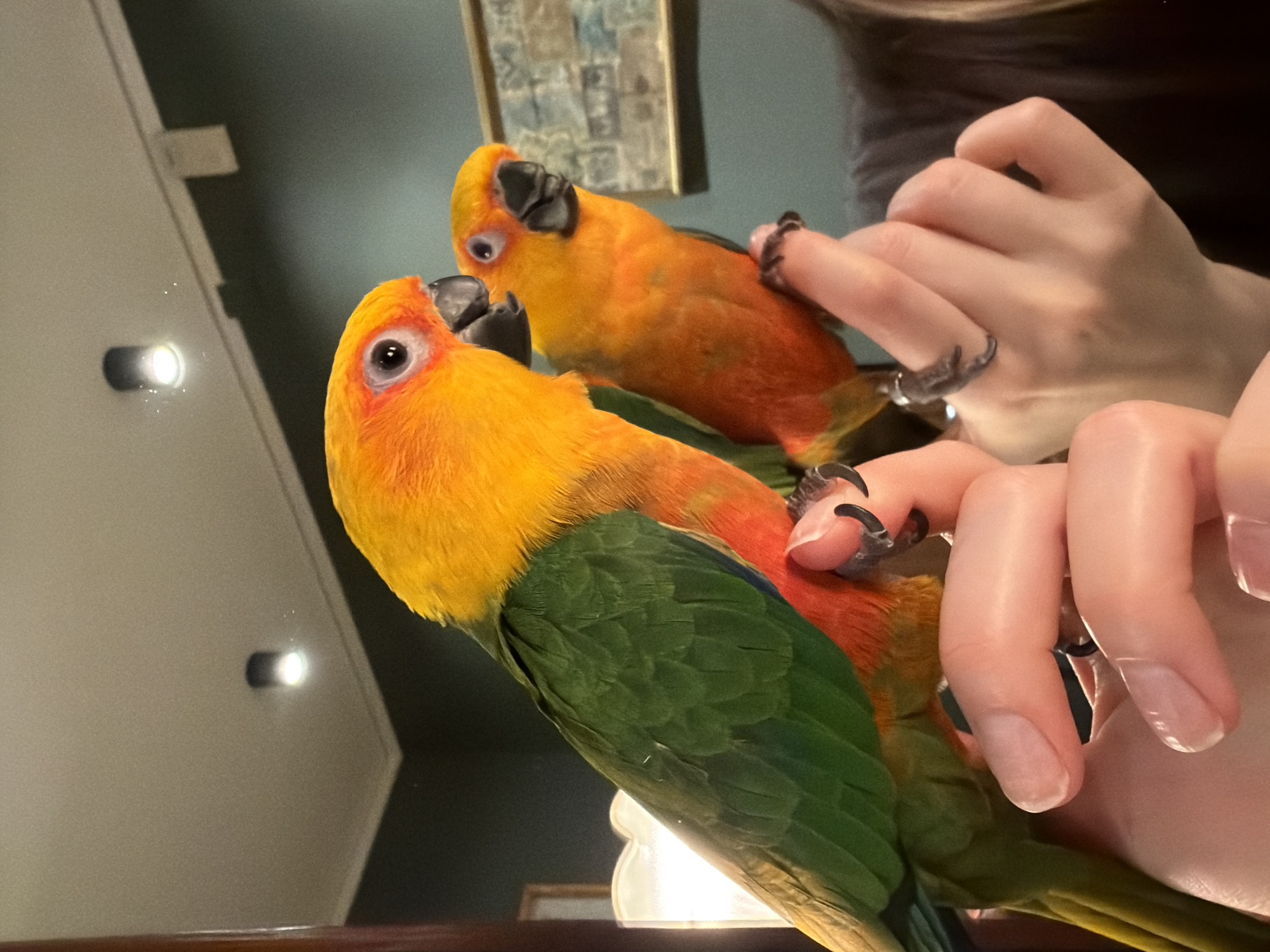 The scene is an indoor environment within a private residence in Khimki, Russia. The primary subject is a Sun Conure parrot (Aratinga solstitialis), characterized by a bright yellow head and upper chest, transitioning to orange-red on its lower chest and belly, with green wings and back. This parrot is perched on the index finger of a human hand, with its dark claws gripping the finger. A large mirror occupies the background, reflecting the parrot, the human hand holding it, and parts of the surrounding room. The reflection clearly shows a second parrot, identical to the first, perched on the reflected index finger of the same individual. The reflected human appears to be wearing a dark-colored garment. The environment reflected in the mirror includes a dark green wall, separated by a light-colored molding from a lighter ceiling. An illuminated, dark-colored cylindrical recessed light fixture is visible on the ceiling. A framed picture with indistinct imagery hangs on the dark green wall. The interaction involves a human holding the parrot, with the scene being captured via reflection, likely through a photographic device not visible in the frame.