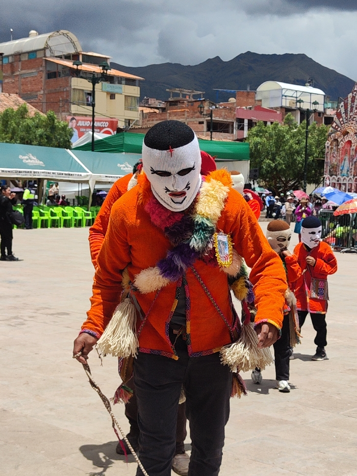Three individuals wearing traditional clothing and masks walk across a paved square. The central figure, in an orange jacket with decorative tassels and a white mask, holds a braided rope. Behind him, two smaller figures in similar attire follow. Buildings and a cloudy sky form the backdrop. A political banner is visible in the background. The event appears to be a cultural celebration.
