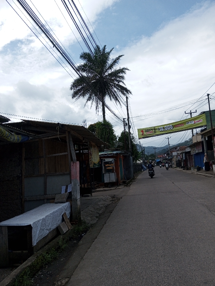 The image depicts a daytime street scene in Ariyalai, Sri Lanka, under a partly cloudy sky. An asphalt road, appearing to be a two-lane street, extends into the background. On the left side, a rustic, single-story structure with a wooden frame and corrugated metal or tarp roofing is visible, partially covered by a blue tarp. In front of this structure, a long, low wooden box or table is draped with a white sheet. Further down the left, a small storefront with a glass display case shows text, including what appears to be "MENU." A tall palm tree stands prominently in the mid-ground, surrounded by a dense network of overhead utility lines and poles that crisscross the sky. Across the street, a large green banner with yellow and white text, including "10.000" and phrases resembling Indonesian script, is stretched between poles. Several people on motorcycles are observed on the road, with one individual on a dark motorcycle riding towards the camera in the foreground. The right side of the street is lined with a series of single-story buildings. In the distant background, hills or mountains are visible beneath the horizon.