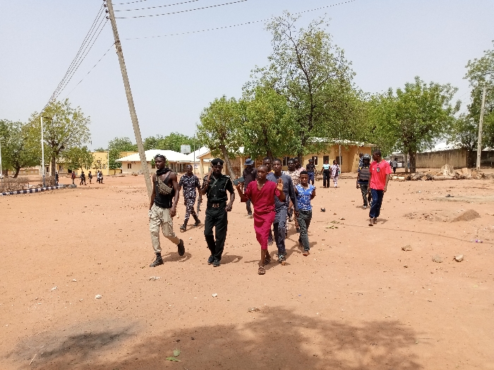 The image depicts a group of people, some in uniform, walking on a dirt road in Jimeta, Nigeria. The road appears to be in front of a building complex, and there are several trees lining the road. The people are walking in a single file line. The person in the lead is wearing a black shirt and brown pants, and appears to be carrying a black bag. The second person in the line is wearing a black uniform and a black hat. The third person is wearing a red shirt and brown pants. The others in the line are similarly dressed in civilian clothing. The scene appears to be a public space.