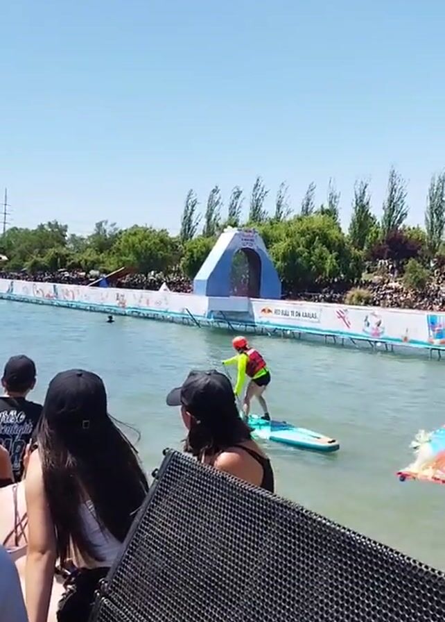 crowd of people watching a paddleboard competition on a sunny day. Two paddleboarders, one in green and one in red, are seen in the water competing. The course is marked with a Red Bull archway. The crowd appears to be watching from a raised platform or seating area. There's music playing in the background.
