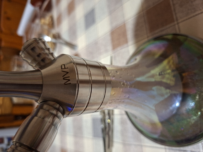 A close-up forensic view captures a multi-hose hookah located in the city of Ihtiman, Bulgaria. The central metallic stem is constructed from brushed, silver-toned metal, featuring the letters "MVP" engraved horizontally on its upper section. Two hose ports are visible on the stem; one extends to the left, and another, partially visible on the right, is fitted with a knurled, textured cap. Directly beneath the metallic stem is an iridescent glass base, exhibiting a pearlescent finish that refracts light into hues of green, blue, and purple. Condensation droplets are distinctly visible on the exterior surface of this glass base. The hookah rests on a table covered with a checkered tablecloth patterned in alternating squares of light brown/tan and white. The background is blurred, showing indistinct shapes that suggest other items on the table and a wooden surface or furniture further back. No individuals are present, and no actions are depicted.