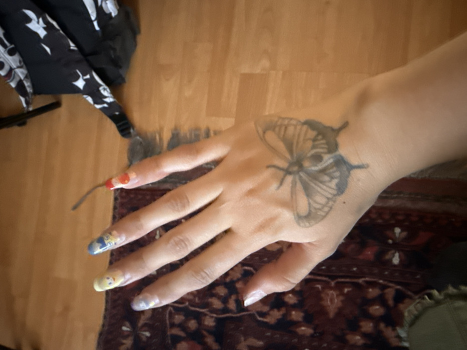 A hand rests on a dark patterned rug, showcasing unique nail art on each finger. A butterfly tattoo adorns the hand near the wrist. The background includes a light-colored wooden floor, a black and white patterned bag, and glimpses of green fabric. The focus is on the hand and its details, with the background providing context.