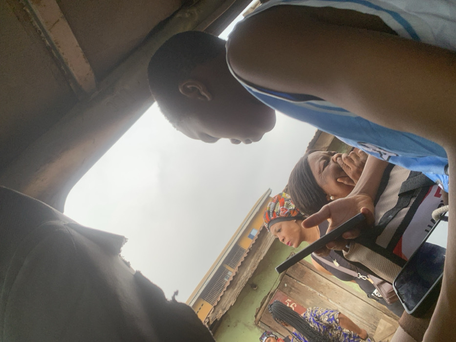 A low-angle shot captures four people, seemingly from within a vehicle. A young individual wearing a blue and white jersey peers down. Three women are visible, one wearing a colorful head wrap and gazing intensely at a mobile device held by a second woman. The second woman holds her hand to her cheek as she looks at the phone. Another woman wearing a purple and gold outfit is also nearby. The setting appears to be an outdoor location.