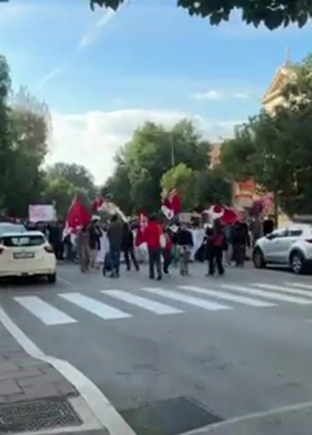 group of people marching across a zebra crossing in a city street. They are carrying red flags with white symbols on them and a white banner with red writing. Some of the marchers are wearing red clothing, and one person is using a megaphone. The street is lined with buildings and trees. Two cars are parked on the side of the road. The sky is blue with some clouds.