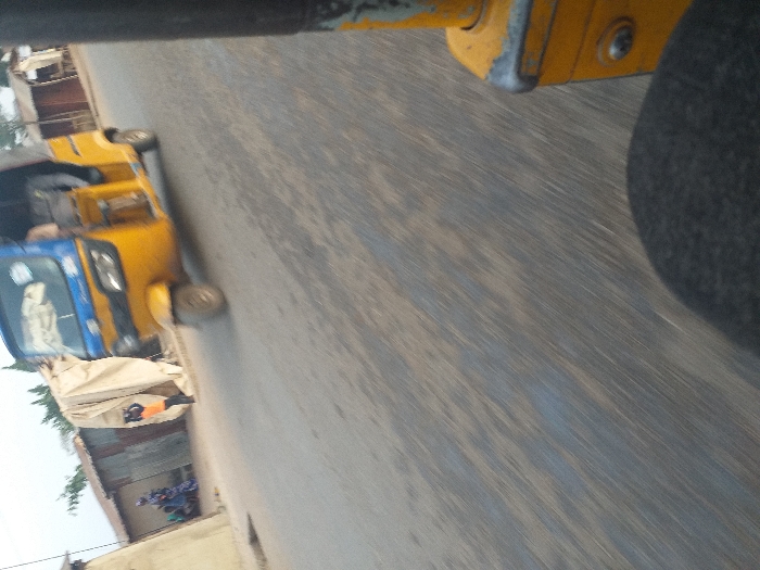 The image portrays an urban street scene in Masaka, Nigeria. In the midground, a yellow and blue three-wheeled auto-rickshaw (Keke Napep) travels on a paved road, exhibiting motion blur consistent with vehicular movement. Indistinct occupants are visible within the auto-rickshaw. In the background, to the left, a light-colored building with a brown roof stands adjacent to a group of approximately three individuals, one clad in blue attire, gathered near the building. To their right, a person wearing an orange top and dark bottoms stands beside a large, light-colored tarp structure. Further right, another building with a corrugated metal roof is present. The paved road surface is dark and shows signs of wear. The immediate foreground, at the bottom right, reveals a dark, textured object and a partial yellow metallic structure, indicating the viewpoint is from inside a moving vehicle. The sky appears light and overcast.