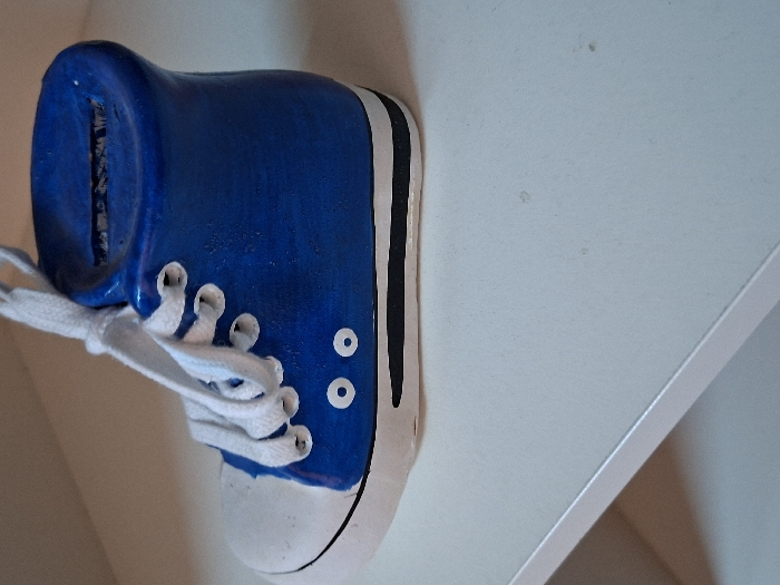 - "The scene displays a ceramic or plaster piggy bank molded in the shape of a blue high-top sneaker, positioned on a light-colored shelf" by FM-VXnjq2, licensed under CC BY 4.0
