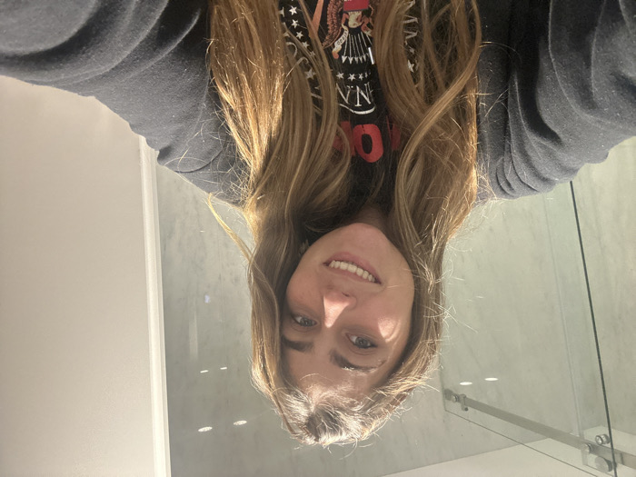 A young adult female is depicted in a close-up selfie within an interior in Aldoar, Foz do Douro e Nevogilde, Portugal. She has long, wavy light brown hair parted on the side, a fair complexion, and a broad smile, directly facing the camera. She wears a black crew-neck sweatshirt over a dark t-shirt with a white and red graphic print featuring stars, partial text including "N'A", and an eagle-like emblem. The background on the left consists of a light-toned, possibly marble, wall with grey veining, behind a clear glass panel or door with a visible top rail and vertical black seal. Two reflected overhead lights are visible through the glass. To the right, a plain, light-colored wall is present. The scene is brightly illuminated.